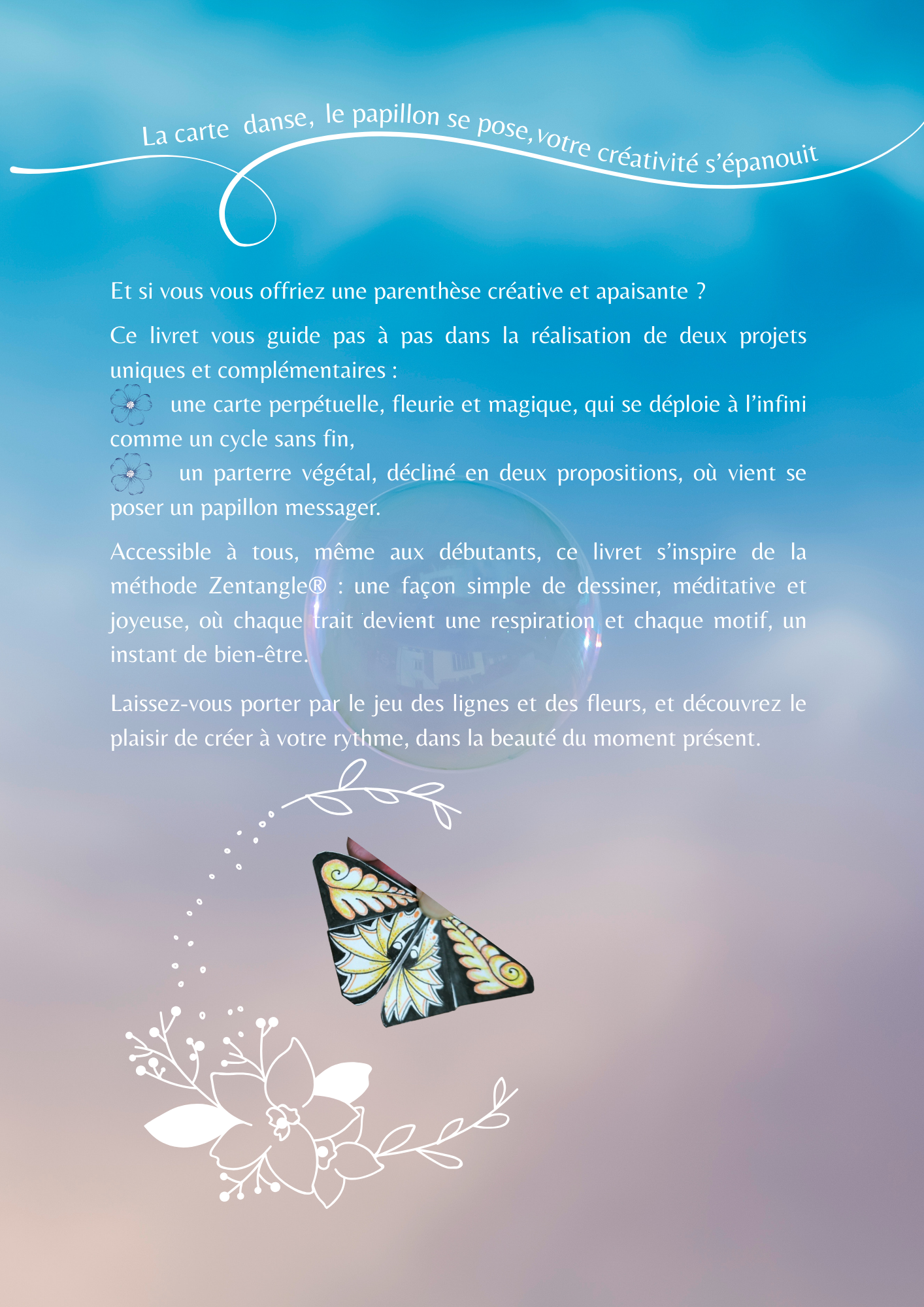 A l’intérieur : des motifs à dessiner lentement, comme une respiration ; un papillon à plier, symbole de transformation ; des motifs qui apaisent pour accompagner le geste artistique.
